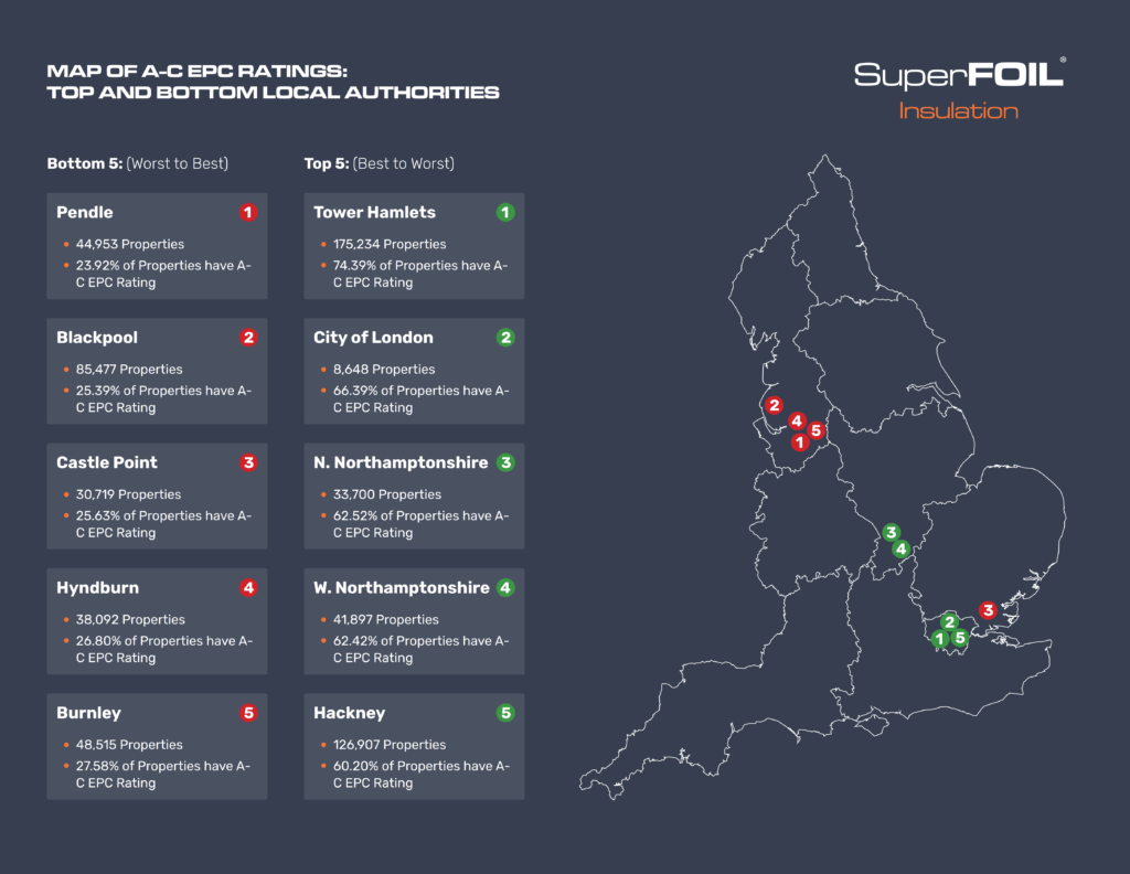 The data shows a wide disparity on a local level, with a 50.47-percentage-point gap between the local authorities with the highest and lowest proportions of properties with an A-C EPC rating.